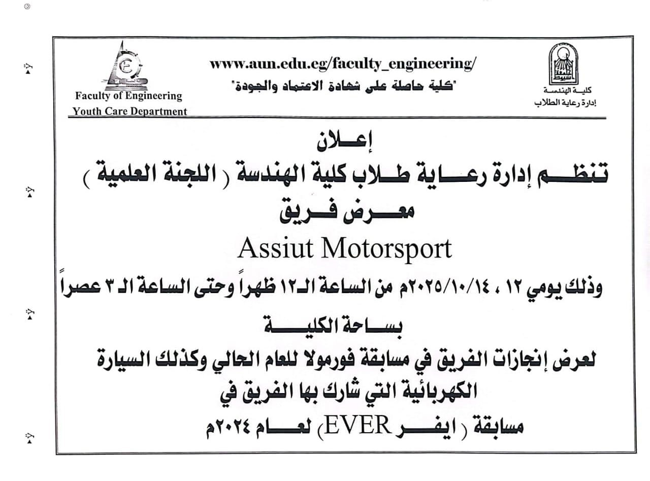 كلية الهندسة-اعلان عن معرض فريق Assiut Motorsport وذلك يومي 12 ،14 اكتوبر من الساعة الــ12 ظهراً وحتى الساعة الـ 3 عصراً بســــاحة الكليــــــــــة