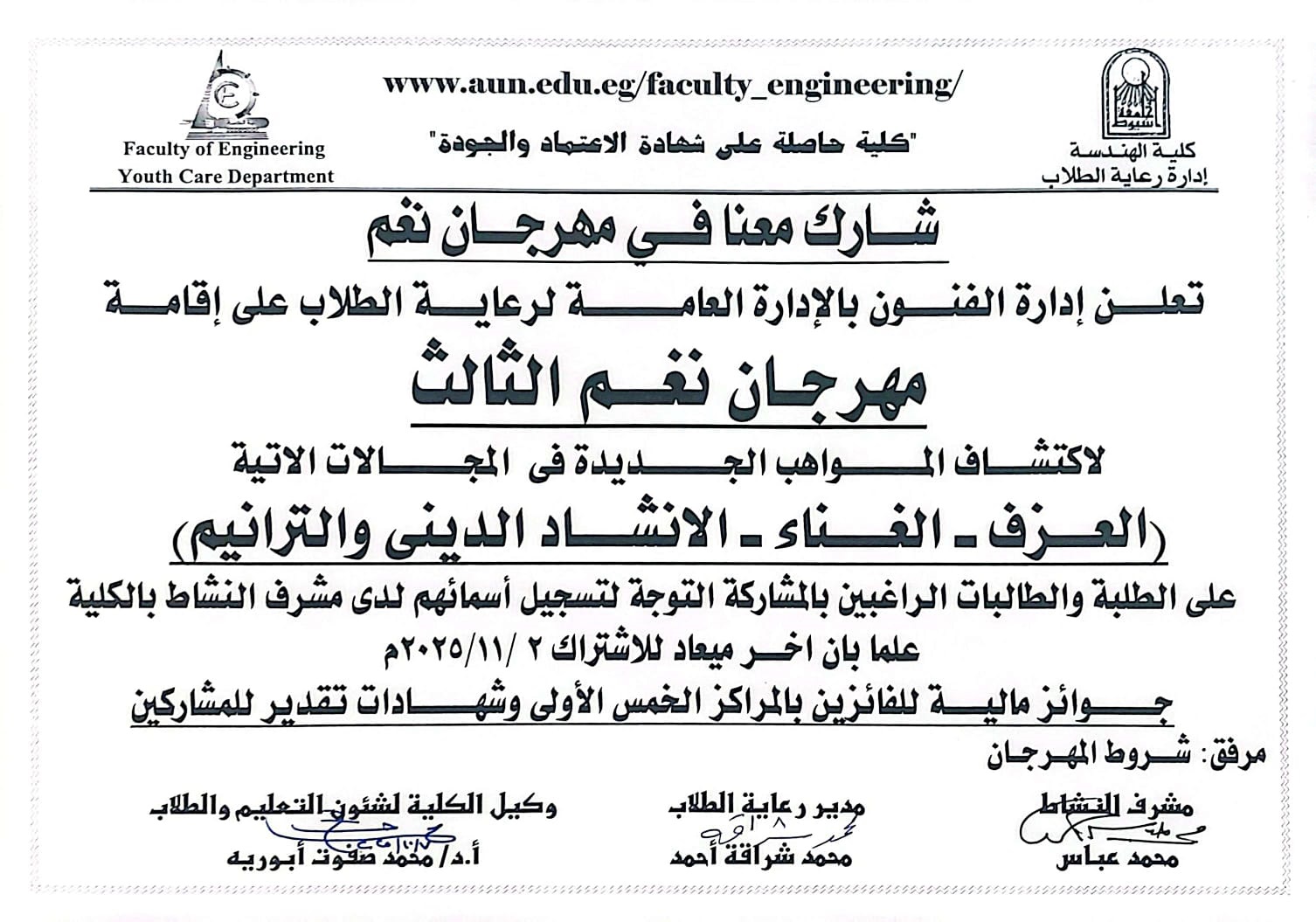 كلية الهندسة .. دعوة لمشاركة طلبة وطالبات الكلية فى مهرجـان نغــم الثالث لاكتشـــاف المــــــواهب الجــــــديدة فى المجــــــالات الاتية (العــزف ـ الغـــناء ـ الانشـــاد الدينى والترانيم)