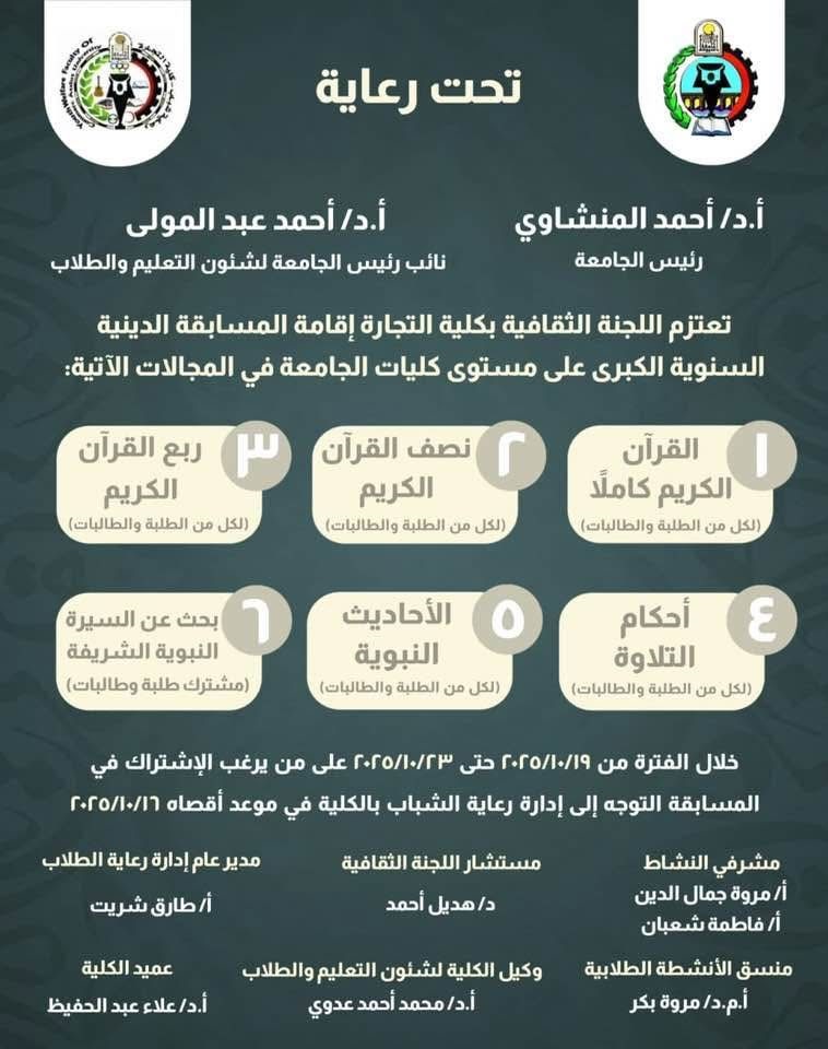 كلية التجارة ... تعتزم اللجنة الثقافية بكلية التجارة إقامة المسابقة الدينية السنوية الكبرى على مستوى كليات الجامعة
