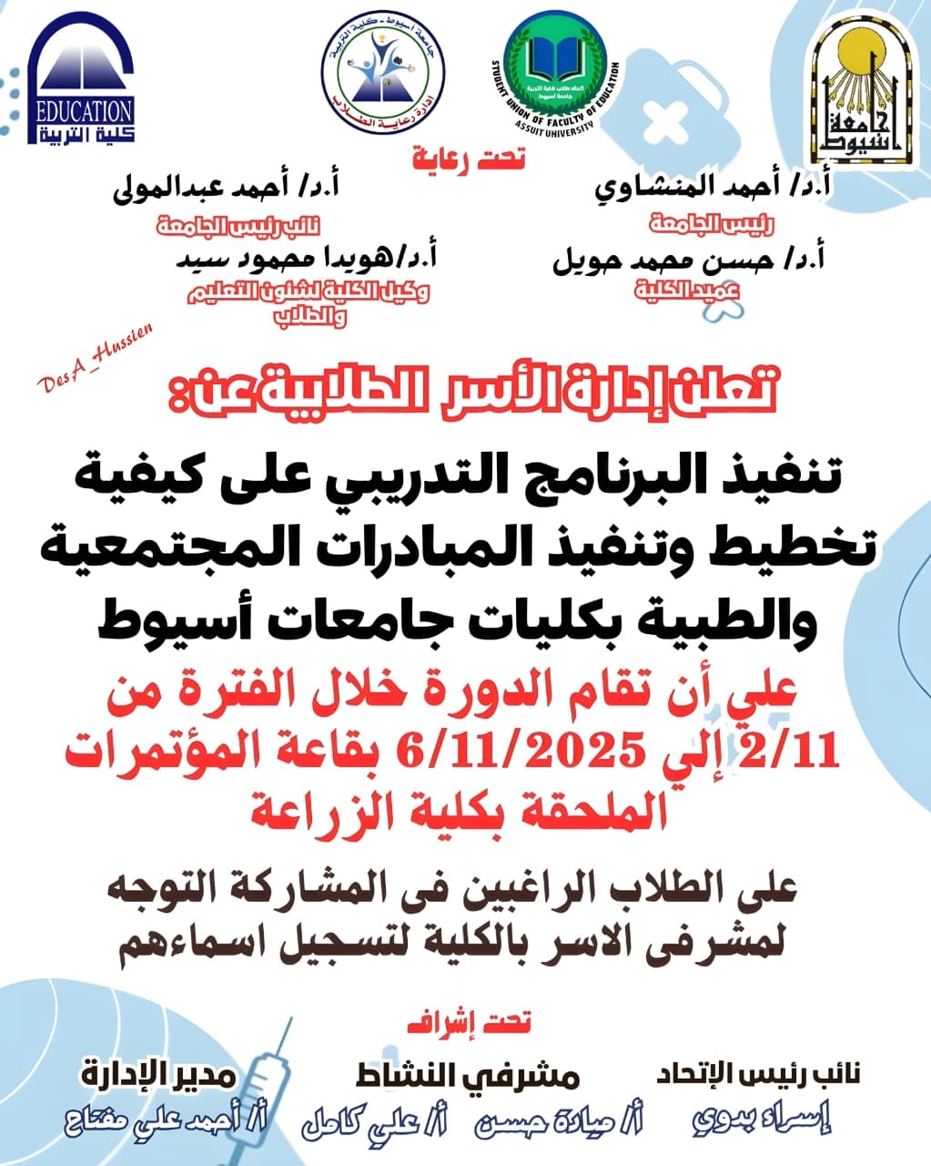 تعلن الإدارة العامة للنشاط الأسر عن تنفيذ البرنامج التدريبي على كيفية تخطيط و تنفيذ المبادرات المجتمعية والطبية بكليات جامعة أسيوط على ان تقام الدورة خلال الفترة يوم الأحد ٢ نوفمبر ٢٠٢٥ حتى يوم الخميس ٦ نوفمبر ٢٠٢٥ بقاعة المؤتمرات الملحقة بكلية زراعة.