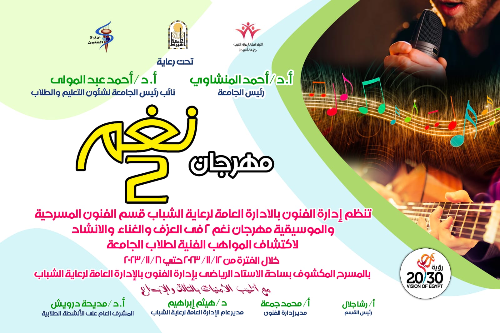 " مهرجان نغم 2 " .. تنظم إدارة الفنون بالإدارة العامة لرعاية الشباب قسم الفنون المسرحية والموسيقية مهرجان نغم 2 فى العزف والغناء والانشاد لاكتشاف المواهب الفنية لطلاب الجامعة خلال الفترة من 12 نوفمبر 2023 حتى 16 نوفمبر 2023 بالمسرح المكشوف بساحة الاستاد الرياضى بإدارة الفنون بالإدارة العامة لرعاية الشباب