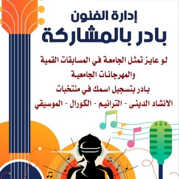 ادارة الفنون بالإدارة العامة لرعاية الطلاب .. دعوة لمشاركة الطلاب والطالبات الموهوبين من طلاب الجامعة في مهرجان (إنسان مبدع) لاكتشاف المواهب الفنية ضمن المبادرة الرئاسية "بداية جديدة " خلال الفترة من ٣نوفمبر إلي ٧ نوفمبر ٢٠٢٤م