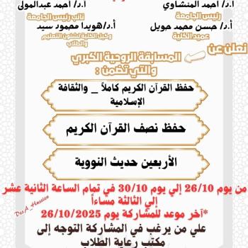 كلية التربية-الاعلان عن المسابقة الروحية الكبرى التي تنظمها الإدارة العامة لرعاية الطلاب للنشاط الثقافى