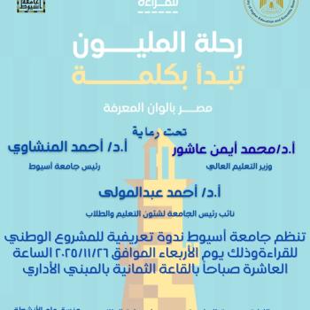 تنظم جامعة أسيوط ندوة تعريفية للمشروع الوطني للقراءة رحلة المليون تبدأ بكلمة مصر بألوان المعرفة