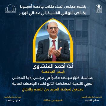 يتقدم مجلس اتحاد طلاب جامعة أسيوط بخالص التهنئة والتقدير إلى معالى الوزير أ.د/أحمد المنشاوي رئيس جامعة أسيوط ،الأب والمعلم والقدوة بمناسبة اختيار سيادته عضوًا في مجلس إدارة المجلس العربي للتنمية المستدامة التابع لاتحاد الجامعات العربية