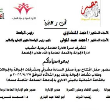 دعوة .. الإدارة العامة لرعاية الشباب إدارة الجوالة والخدمة العامة بالتعاون مع اتحاد طلاب الجامعة تدعوكم لحضور حفل افتتاح دورة صقل السادة مشرفي ومشرفات الجوالة والجوالات وطلاب نشاط الجوالة اليوم الثلاثاء ٢٧ سبتمبر ٢٠٢٢م بالقاعه الثمانيه بالمبنى الاداري