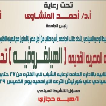 تنظم الادارة العامة لرعاية الشباب وحدة تنمية وتنشيط الوعى السياحى و اتحاد طلاب الجامعة واسرة طلاب من اجل مصر الملتقى الفنى لدعم واحياء اللغة المصرية القديمة " الهيلغروفية " تحت مسمى ريشة سياحية