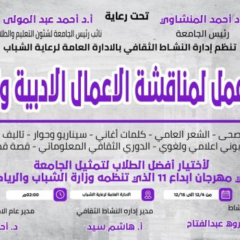 تنظم الإدارة العامة لرعاية الشباب - ادارة النشاط الثقافي .. ورشة عمل لمناقشة الأعمال الادبيه والثقافيه في مجالات " الشعر الفصحي_الشعر العامي_كلمات اغاني _سناريو وحوار _تاليف مسرحي _مراسل تليفزوني اعلامي ولغوي _الدوري الثقافي المعلوماتي _قصه قصيره_روايه "