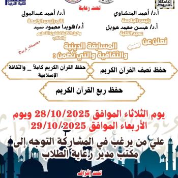 كلية التربية-الاعلان عن المسابقة الدينية والثقافية التي تنظمها إدارة رعاية الطلاب للنشاط الثقافى
