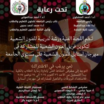 كلية التجارة ... تنظم اللجنة الفنية ورشة تدريبية للفنون الشعبية لتكوين فريق الفنون الشعبية للمشاركة فى مهرجان أستايل للفنون الشعبية على مستوى الجامعة