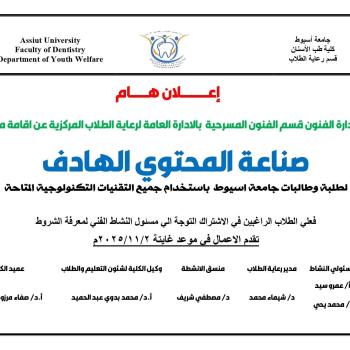 كلية طب الاسنان- الاعلان عن مسابقة صناعة المحتوى الهادف التى تنظمها إدارة الفنون المسرحية