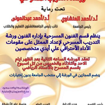 ينظم قسم الفنون المسرحية بإدارة الفنون ورشة التدريب المسرحى لإعداد الممثل على مقومات الأداء الاحترافي على أيدى متخصصين ... إدارة الفنون بالادارة العامة لرعاية الطلاب