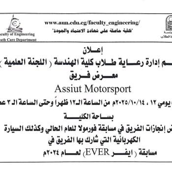 كلية الهندسة-اعلان عن معرض فريق Assiut Motorsport وذلك يومي 12 ،14 اكتوبر من الساعة الــ12 ظهراً وحتى الساعة الـ 3 عصراً بســــاحة الكليــــــــــة