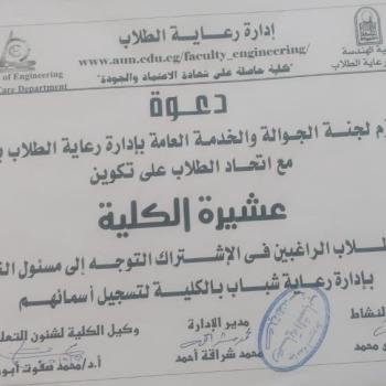 كلية الهندسة-تعتــزم لجنــة الجـوالة والخدمـة العامة بإدارة رعاية الطلاب بالتعاون مع اتحــاد الطلاب على تكوين عشيرة الكلية