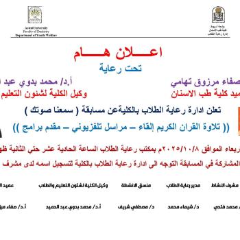 كلية طب الأسنان - إعلان عن إقامة مسابقة سمعنا صوتك في القران الكريم والإلقاء والمراسل التلفزيوني ومقدم البرامج