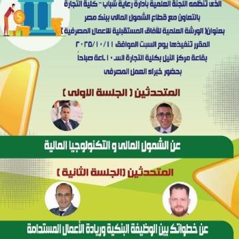 كلية التجارة .. اقامة المنتدى المالي المصرفي الذى تنظمة اللجنة العلمية بأدارة رعاية الطلاب - كلية التجارة بالتعاون مع قطاع الشمول المالى ببنك مصر بعنوان - الورشة العلمية للافاق المستقبلية للاعمال المصرفية - المقرر تنفيزها يوم السبت الموافق 11 أكتوبر 2025