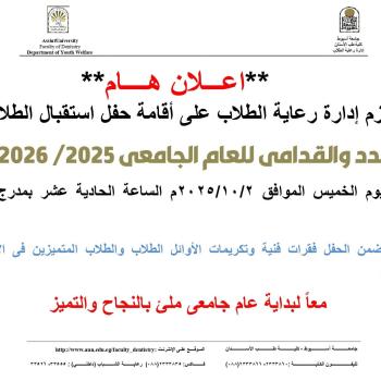 كلية طب أسنان - الإعلان عن إقامة حفل أستقبال الطلاب الجدد والقدامى للعام الجامعي 2025/ 2026