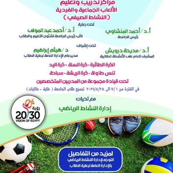 دعوة لمشاركة الطلاب والطالبات بكليات الجامعة في مراكز التدريب وتعليم الألعاب الجماعية والفردية بالنشاط الصيفي إدارة النشاط الرياضي بالإدارة العامة لرعاية الطلاب