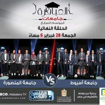 ترقبوا المباراة النهائية من الموسم السابع لبرنامج العباقرة جامعات مع الروائي عصام يوسف بين جامعة المنصورة وجامعة أسيوط الليلة الساعة 6:00 مساء على قناة القاهرة_والناس