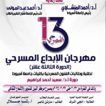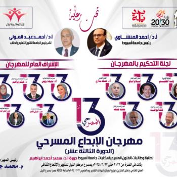 ادارة الفنون .. مهرجان الابداع المسرحي الدوره الثالثه عشر لطلبة وطالبات الفنون المسرحية بكليات جامعة اسيوط دورة ا.د سعيد احمد ابراهيم وذلك في الفتره من٢/٢٢ حتي ٢٠٢٥/٢/٢٧م بمسرح مركز النيل للتنوير والأشعاع الثقافي