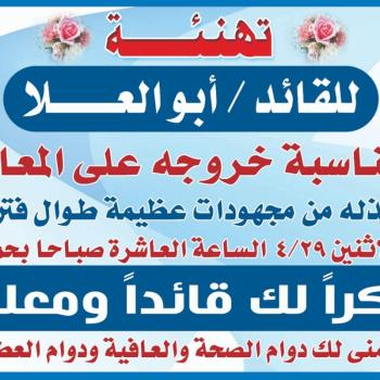 دعوة للحضور . تنظم الإدارة العامة لرعاية الشباب غدا حفل المعاش للقائد /أبو العلا عبد البارى مدير إدارة الجواله والخدمه العامه الساعة العاشرة صباحا بقاعة حمام السباحة بالقرية الاوليمبية