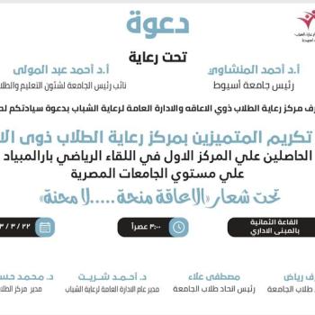 دعوه للحضور .. ينظم مركز رعايه الطلاب ذوي الاعاقة بالادارة العامة لرعاية الشباب حفل تكريم المتميزين من طلاب المركز والحاصلين علي المركز الأول في اللقاء الرياضي علي مستوي الجامعات المصرية تحت شعار " الاعاقة منحة .. لا محنة "