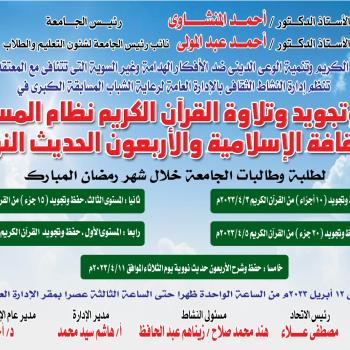 إدارة النشاط الثقافي بالادارة العامة لرعاية الشباب ...بمناسبة شهر رمضان الكريم وتنمية الوعي الدينى ضد الافكار الهدامة وغير السوية التي تتنافى مع المعتقدات الدينية السمحة .. تنظم الادارة المسابقة الدينية الكبرى لطلبة وطالبات جامعة اسيوط