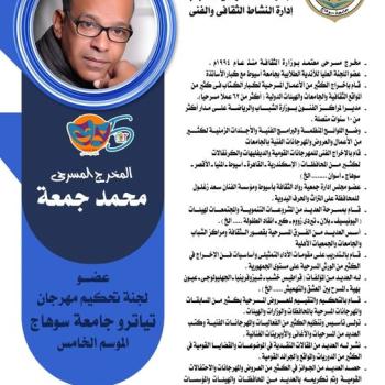 الفنان م. محمد جمعة مدير عام ادارة الفنون بالادارة العامة لرعاية الشباب جامعة اسيوط .. يشارك عضوا فى لجنة تحكيم مهرجان تياترو بجامعة سوهاج وذلك بمشاركة ١٧ عرض مسرحى