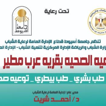 تنظم جامعة اسيوط قطاع الادارة العامة لرعاية الشباب بالتعاون مع وزارة الشباب والرياضة الادارة المركزية لتنمية الشباب - الادارة العامة للجامعات .. القافلة الطبية والبيطرية والتوعية الصحية لقرى عرب مطير مركز الفتح محافظة اسيوط