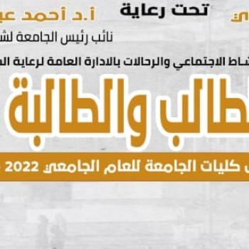 تنظم الإدارة العامة لرعاية الشباب _ادارة النشاط الاجتماعي والرحلات ... مسابقه الطالب والطالبه المثاليين علي مستوي كليات الجامعه للعام 2022/ 2023 في الفتره من ٤ ديسمبر حتي ١٥ ديسمبر بقاعه المناقشات المبني الادارى الساعه ٢م