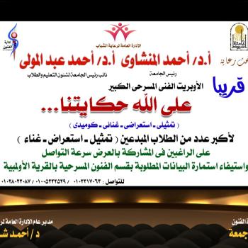 تنظم قريبا إدارة الفنون ... الأوبرت الفني المسرحي الكبير "على الله حكايتنا" على الطلاب الراغبين فى المشاركة بالعرض سرعة التواصل واستيفاء استمارة البيانات المطلوبة بقسم الفنون المسرحية بالجامعة