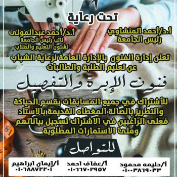 تعلن الإدارة العامة لرعاية الشباب إدارة الفنون .. عن تعليم الطلبة والطالبات فنون الإبرة والتفصيل الاشتراك فى جميع المسابقات بقسم الحياكة والتطريز بالصالة المغطاة القديمة .فعلي الطلاب الراغبين في الاشتراك تسجيل بياناتهم وملئ الاستمارات المطلوبة