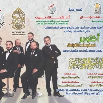 جامعة اسيوط ... تنظم أسرة طلاب من أجل مصر بالتعاون مع اتحاد طلاب الجامعة حفل العاشر من رمضان " اكتوبر أسترداد الكرامة " يوم الأحد ١٠ ابريل الساعة ٩ مساء ليلة العاشر من رمضان بأرض المخيم الكشفى بالجامعة