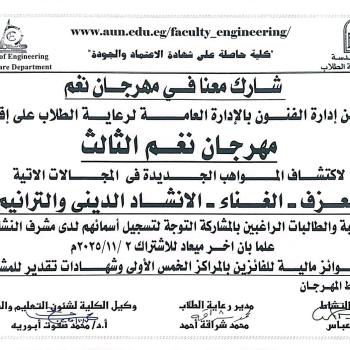 كلية الهندسة .. دعوة لمشاركة طلبة وطالبات الكلية فى مهرجـان نغــم الثالث لاكتشـــاف المــــــواهب الجــــــديدة فى المجــــــالات الاتية (العــزف ـ الغـــناء ـ الانشـــاد الدينى والترانيم)