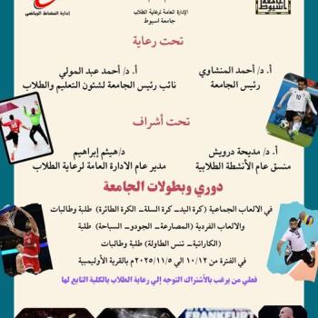كلية طب الأسنان - الاعلان عن إقامة بطولة اللياقة البدنية لطلبة وطالبات كليات جامعه اسيوط التي تنظمها إدارة الفنون العامه لرعاية الطلاب المركزية