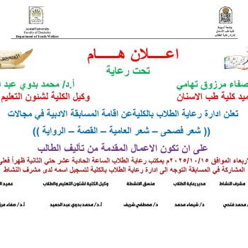 كلية طب الأسنان - تعلن اللجنه الثقافية عن القيام بالمسابقة الإدبية فى مجالات الشعر الفصيح والشعر العامي والقصص والروايات