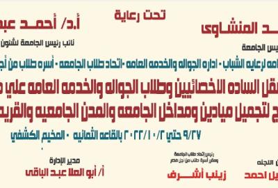 جامعة اسيوط وقطاع الادارة العامة لرعاية الشباب واتحاد طلاب الجامعة واسرة طلاب من اجل مصر يرحبون بحضور السيد الاستاذ الدكتور طايع عبد اللطيف مستشار وزير التعليم العالى والبحث العلمي للأنشطة الطلابية