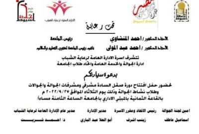 دعوة .. الإدارة العامة لرعاية الشباب إدارة الجوالة والخدمة العامة بالتعاون مع اتحاد طلاب الجامعة تدعوكم لحضور حفل افتتاح دورة صقل السادة مشرفي ومشرفات الجوالة والجوالات وطلاب نشاط الجوالة اليوم الثلاثاء ٢٧ سبتمبر ٢٠٢٢م بالقاعه الثمانيه بالمبنى الاداري