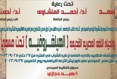 تنظم الادارة العامة لرعاية الشباب وحدة تنمية وتنشيط الوعى السياحى و اتحاد طلاب الجامعة واسرة طلاب من اجل مصر الملتقى الفنى لدعم واحياء اللغة المصرية القديمة " الهيلغروفية " تحت مسمى ريشة سياحية