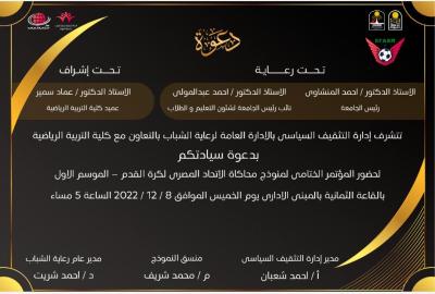 تتشرف الإدارة العامة لرعاية الشباب - ادارة التثقيف السياسي بالتعاون مع كلية التربية الرياضية دعوة لحضور المؤتمر الختامى لفاعليات نموذج محاكاة " الإتحاد المصري لكرة القدم" الموسم الاول بالقاعة الثمانية الساعة السادسة مساءا.
