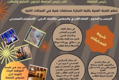 كلية التجارة ... تنظم اللجنة الفنية بكلية التجارة مسابقات فنية فى الرسم والتصوير - الغناء الفردى والجماعى والانشاد الدينى - الاسكتش المسرحى