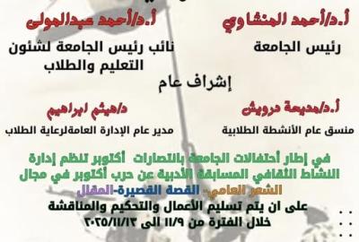 دعوة لمشاركة الطلاب والطالبات بكليات الجامعة المختلفة في مسابقة حرب أكتوبر (المسابقة الأدبية في مجال الشعر العامي _ القصة القصيرة _ إدارة النشاط الثقافي بالإدارة العامة لرعاية الطلابلمقال ) -