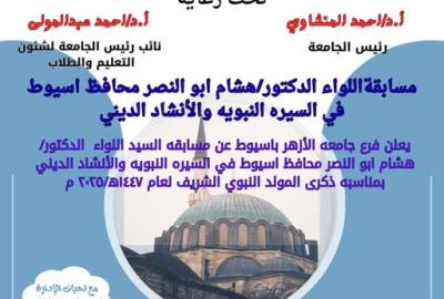 دعوة للمشاركة فى مسابقة اللواء الدكتور / هشام أبو النصر محافظ أسيوط فى السيرة النبوية والأنشاد الديني - إدارة النشاط الثقافى وإدارة الفنون بالإدارة العامة لرعاية الطلاب