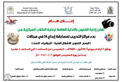 كلية طب الأسنان - الاعلان عن بدء مراكز التدريب لمسابقة ابداع 14 في مجالات الرسم والتصوير والاشغال الفنية والجرافيك والنحت التي تنظمها إدارة الفنون العامه لرعاية الطلاب المركزية