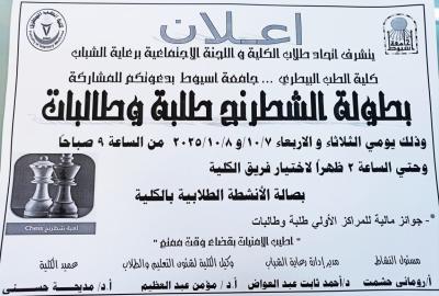 كلية الطب البيطرى : يتشرف أتحاد طلاب الكلية واللجنة الاجتماعية برعاية الشباب كلية الطب البيطرى جامعة أسيوط بدعوتكم للمشاركة بطولة الشطرنج طلبة وطالبات