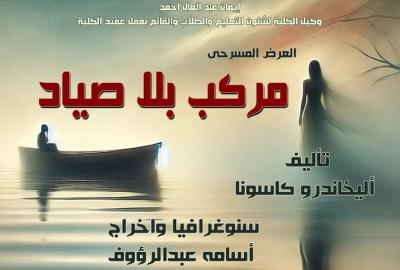 الاربعاء ٢٦ فبراير بقاعة النيل بجامعة أسيوط ١٢ ظهرا .. منتخب كلية الخدمة الاجتماعية يقدم مسرحية " مركب بلا صياد " ضمن فاعليات مهرجان ابداع جامعة أسيوط