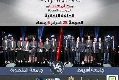 ترقبوا المباراة النهائية من الموسم السابع لبرنامج العباقرة جامعات مع الروائي عصام يوسف بين جامعة المنصورة وجامعة أسيوط الليلة الساعة 6:00 مساء على قناة القاهرة_والناس