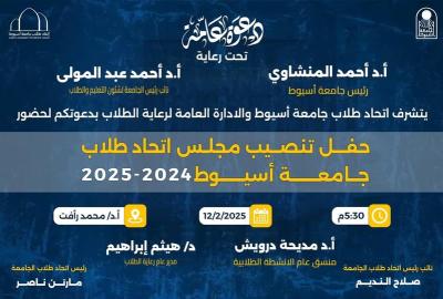دعوة لحضور جميع الطلاب والطالبات بالجامعة لحضور حفل تنصيب مجلس اتحاد طلاب جامعة أسيوط 2024/2025