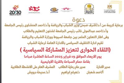 ادارة التثقيف السياسي بالادارة العامة لرعاية الطلاب .. يسرنا أعزائي الطلاب دعوتكم للمشاركة في اللقاء الحوارى لطلاب جامعة أسيوط وذلك يوم الأربعاء الموافق ١٩ فبراير ٢٠٢٥ بقاعة حمام السباحة بالقرية الأولمبية الساعة التاسعة والنصف صباحا