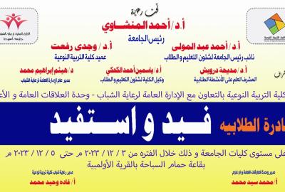 نظمت كلية التربية النوعية بالتعاون مع وحدة العلاقات العامة والاعلام بالادارة العامة لرعاية الشباب .. المبادرة الطلابية " فيد وأستفيد " علي مستوي كليات الجامعة خلال الفترة من ٣حتي ٥ ديسمبر بقاعة حمام السباحة بالقرية الأوليمبية